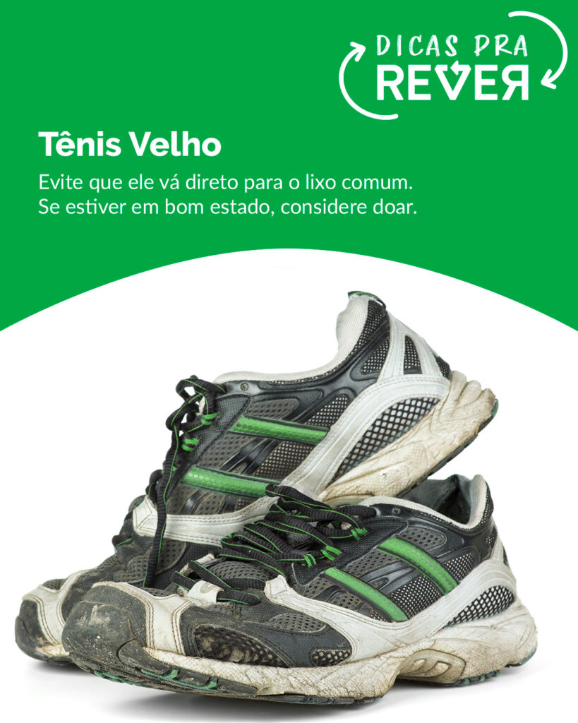 👟 Tênis velho também precisa de destino certo! Quando aquele par de tênis já não serve mais para uso, o ideal é evitar que ele vá direto para o lixo