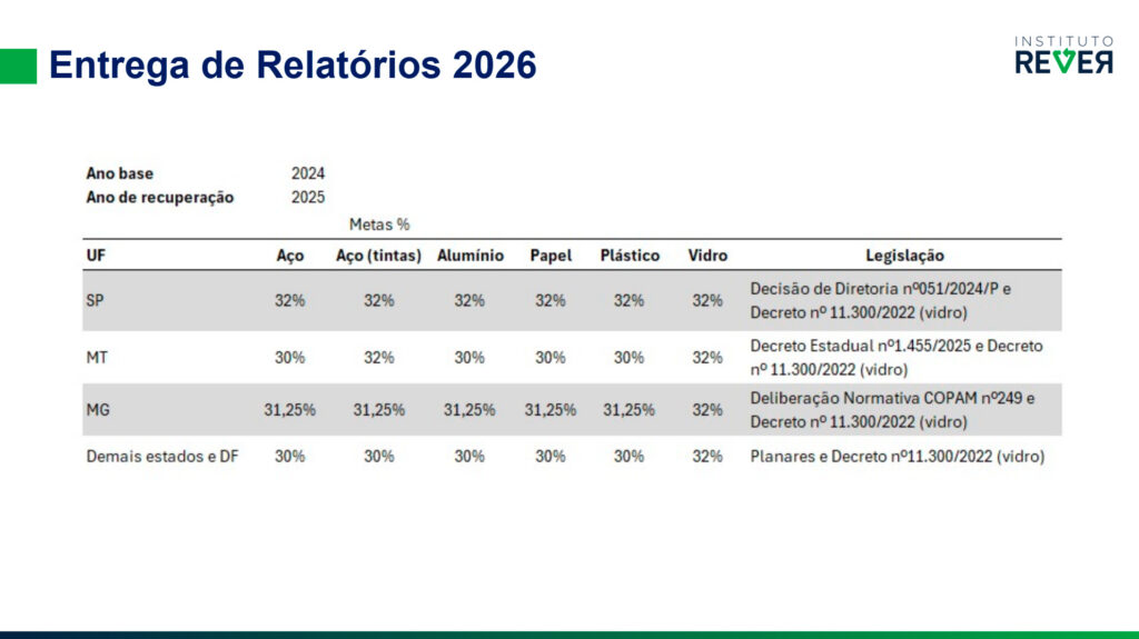 Para apoiar sua empresa, o Instituto Rever disponibiliza suporte no levantamento de custos relacionados à massa de embalagens que precisa ser compensada para as entregas de 2026. Confira as metas e os prazos de entregas para o próximo ano.
