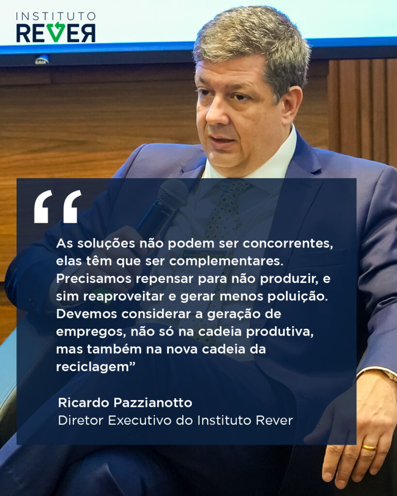 O Instituto Rever, representado pelo diretor executivo Ricardo Pazzianotto, teve papel central no debate: em sua fala, ele ressaltou que “as soluções não podem ser concorrentes, elas têm que ser complementares. Precisamos repensar para não produzir, e sim reaproveitar e gerar menos poluição. Devemos considerar a geração de empregos, não só na cadeia produtiva, mas também na nova cadeia da reciclagem.”